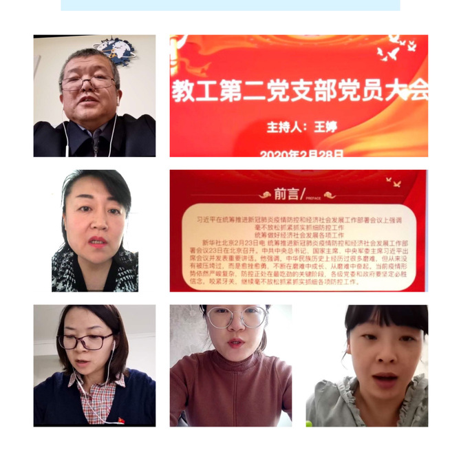2020年2月28日下午6:00,擦边短剧 教工第二党支部召开了一次网络视频会议。本次会议围绕习近平总书记2月23日在统筹推进新冠肺炎疫情防控和经济社会发展工作部署会议上的讲话,以学讲话、谈体会为形式,认真领会讲话精神,结合学习感受和自身工作等进行了积极踊跃的发言。其中,柴芸和杨晓丽表达了党员们不忘初心、牢记使命的决心,冯娟和徐梅谈到作为“三进两联一交友”老师和班主任对学生的关心关爱,史晓薇赞叹了90后参与志愿者活动的学生成为了同学们的榜样,刘海杰和李明霞谈到了积极响应脱贫攻坚战的工作部署,闫兴红和迪丽胡玛尔就习近平总书记的绿水青山就是金山银山和保护野生动物联系在了一起,阿丽亚和陈蓓表达了对在一线医护人员的付出的敬佩,何剑利和黄璐谈到了目前的停课不停学工作。常光辉从六个方面总结了习近平总书记的讲话,表示这次疫情是一次危机也是一场对党员的考验,就目前党员服务工作队、网络授课、学工工作等给予了赞扬。最后,支部书记王婷做了总结发言,并嘱咐大家安顿好自己的小家,安排好自己的教学,此外她对近期支部的三会一课工作也做出了安排和计划。作为结束语,她说相信一定会春暖花开。