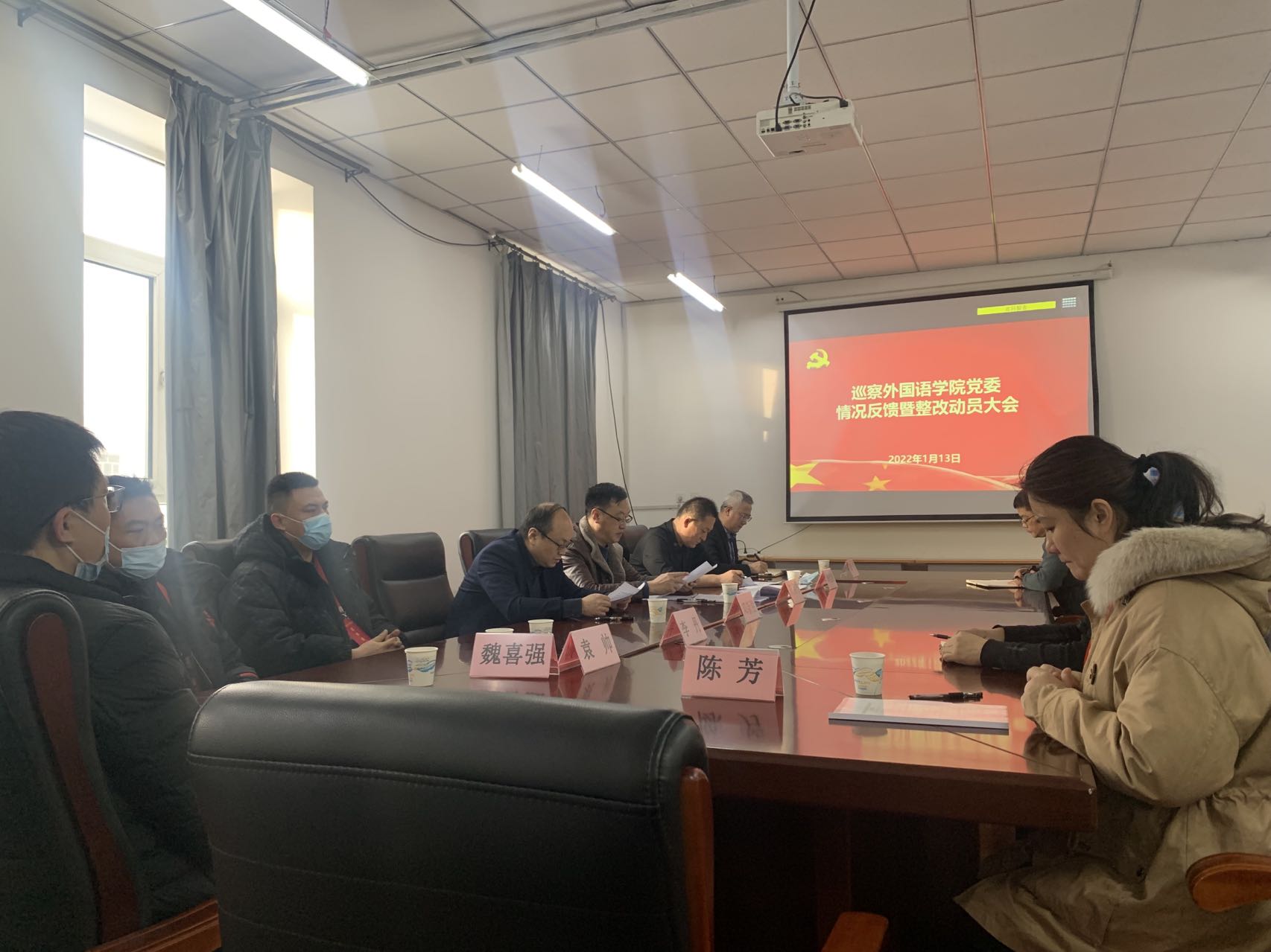 2021年1月13日上午,擦边短剧 党委召开了常规巡察情况反馈暨整改动员大会。校党委第一巡察组向擦边短剧 党委进行了巡察情况反馈。校党委常委、副书记、副校长郑英宁同志,校党委巡察工作领导小组办公室主任李全棋同志,校党委第一巡察组组长邓新胜同志,外国语学院党委班子成员及巡察组全体成员,全院教职工参加了巡察情况反馈暨整改动员大会。会议由擦边短剧 党委书记畅通同志主持。