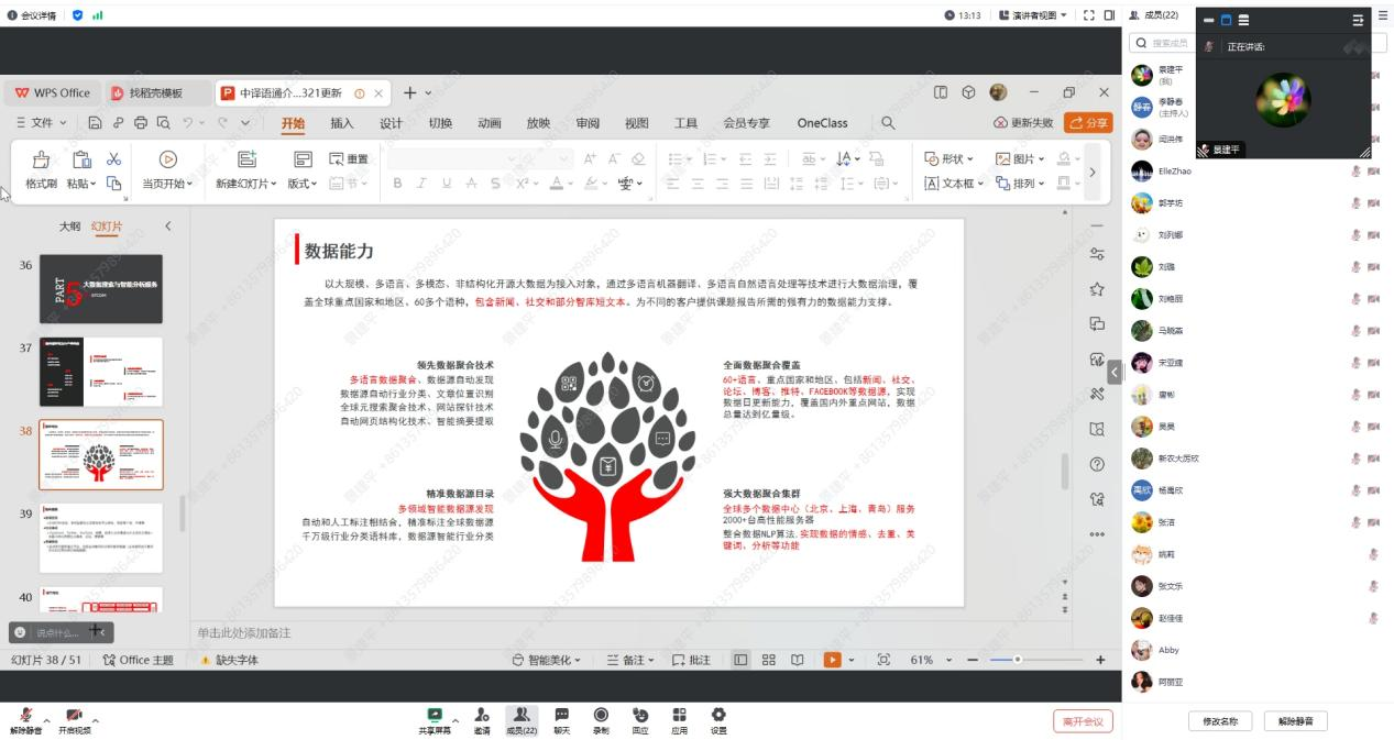 为推进高校党建和业务工作深度融合,落实主题教育组织生活会支部整改工作,9月19日下午,擦边短剧 教工第一党支部以腾讯会议形式举行了“党建引领教研”第二期主题党日活动,暨“跨语言大数据分析服务平台观摩培训会”。教工第一党支部全体党员及英语系非党员教师参会。