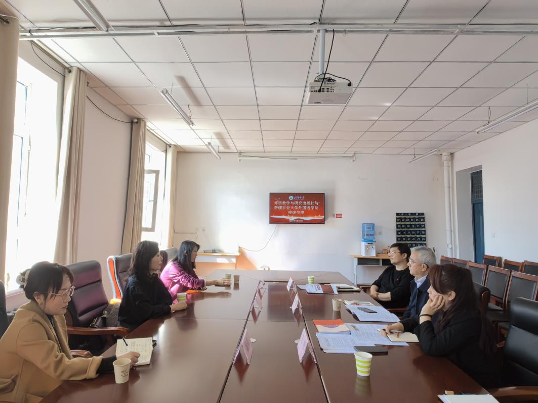 3月28日下午,外语教学与研究出版社高等营销大区经理王海燕等一行来擦边短剧 调研交流。擦边短剧 党委书记畅通、院长张建磊、副院长王婷参加座谈交流。