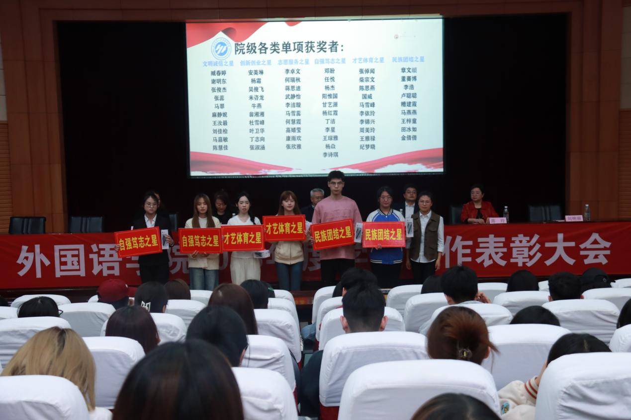 大学英语系主任刘艳丽老师为院级“文明诚信之星”、“创新创业之星”、“志愿服务之星”、“自强笃志之星”、“才艺体育之星”、“民族团结之星””颁奖