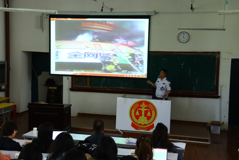 成警官围绕消防法律法规、火灾燃烧常识、火灾防控对策、消防设施介绍及使用、火灾处置和疏散知识、火灾自救逃生知识等六个方面,用案例的形式对消防安全工作做了全面的介绍,引导大家对如何预防火灾、正确使用灭火器及如何及时扑救初起火灾等实用性较强的消防安全知识有了更加深入的认识。通过新闻报道、视频等多种方式生动形象地讲解了近年来国内高校发生的消防安全事故案例,用“血的教训”引起大家对消防安全的高度重视,让大家自觉珍爱生命,远离火灾。