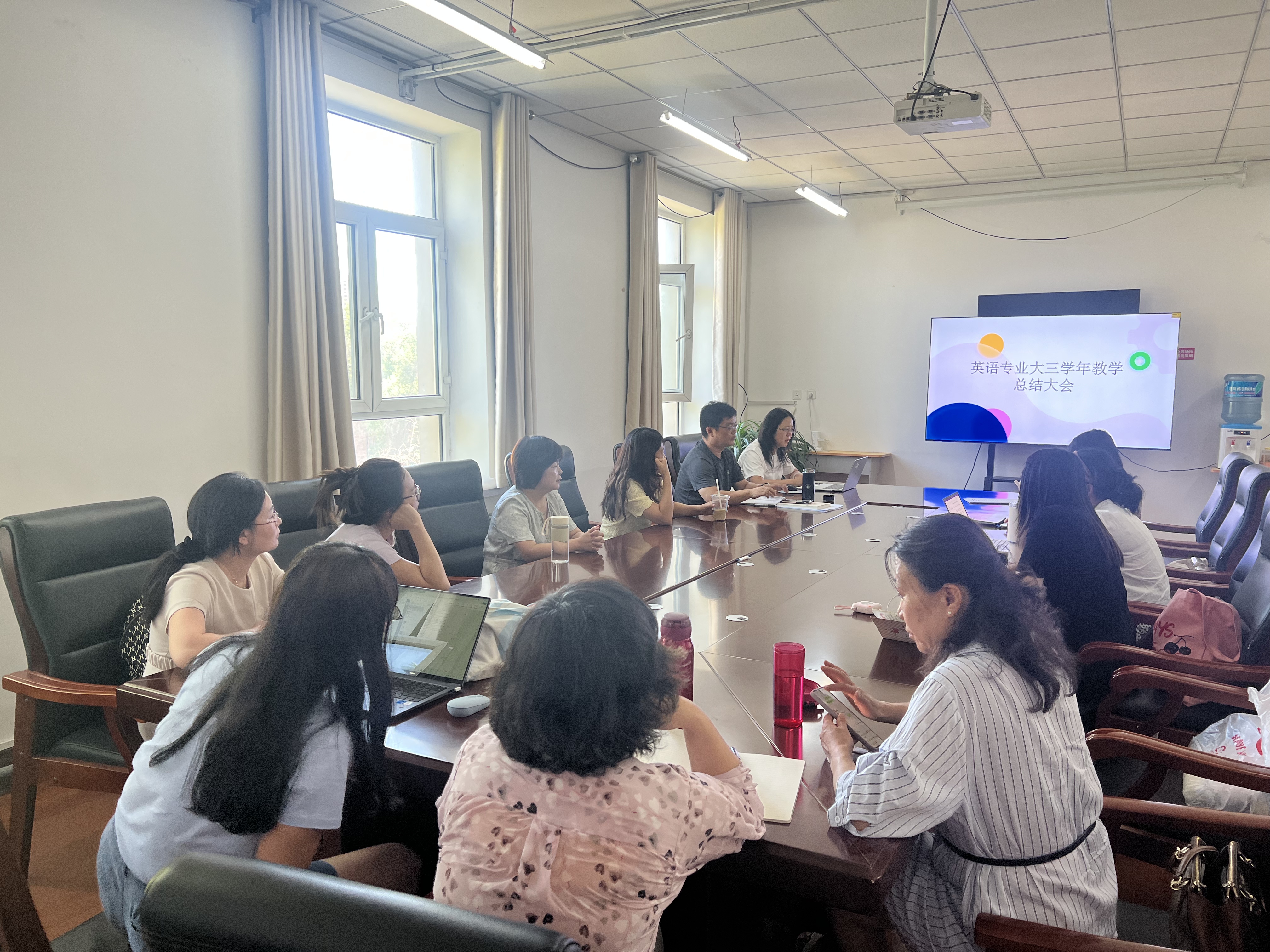 7月9日,英语专业大三年级召开本学期教学总结大会,大三年级全体任课教师参会。此次会议旨在全面总结大三年级英美文学、翻译课程、俄语、日语、高级英语课程的教学情况与成效,为下学年大四相关课程教学的有效衔接提供方案,夯实教学基础,提升育人质量。