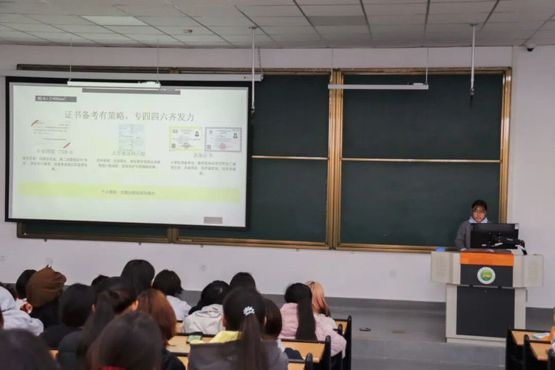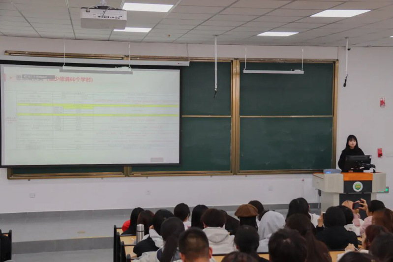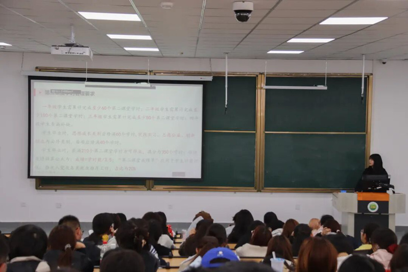 邓盼同学介绍,“第二课堂”是同学们参与各类活动的重要记录和评价体系,与第一课堂学习成绩同等重要,是毕业资格审查和评奖评优的重要依据。她通过清晰的PPT,逐一讲解了思想成长、实践实习、志愿公益、创新创业、文体活动、工作履历、技能特长七大模块的学分构成与认定标准。