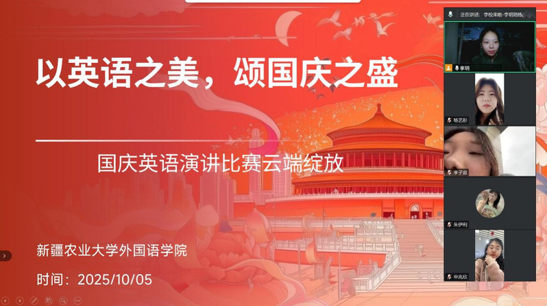 七十六载风雨兼程,中华民族在复兴之路上铸就不朽荣光。为持续深化爱国主义教育,引导青年学子厚植家国情怀、增强文化自信,擦边短剧 线上举办“欢度国庆,礼赞中华”主题英文演讲比赛。在主持人的组织下,在热烈的氛围中,选手们以真挚语言围绕阅兵盛典、新疆七十年巨变、青年使命等主题,传递心声、抒发热爱。