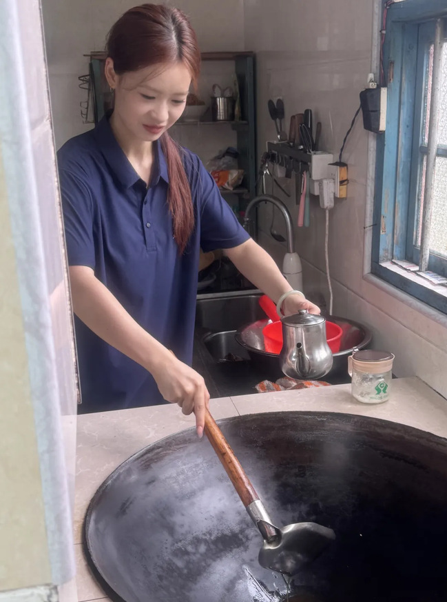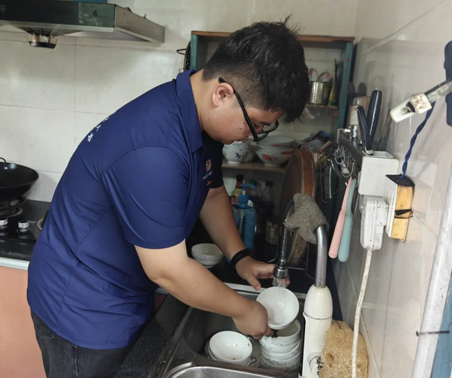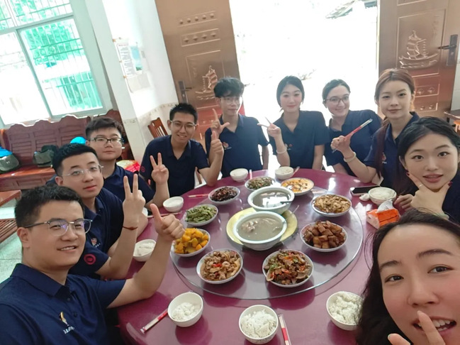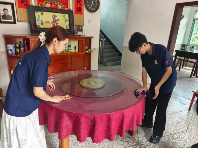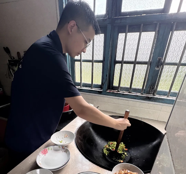 急行军后的午餐时间,实践团走进当地农户家中体验“自制红军餐”。热情的阿姨早已备好午餐食材,队员们撸起袖子投入“战斗”—— 灶台前,杨霜和陈舒帆负责掌勺制作干煸豆角,辣椒炒肉;另一边,刘晋竹带领“后勤组”埋头洗碗,其他队员扫地、整理桌椅,农户小院瞬间热闹非凡。一餐一饭间,青年学子与老乡围坐唠家常,听老人讲述井冈山的变迁,真切感受到“军民团结如一人”的深厚情谊。