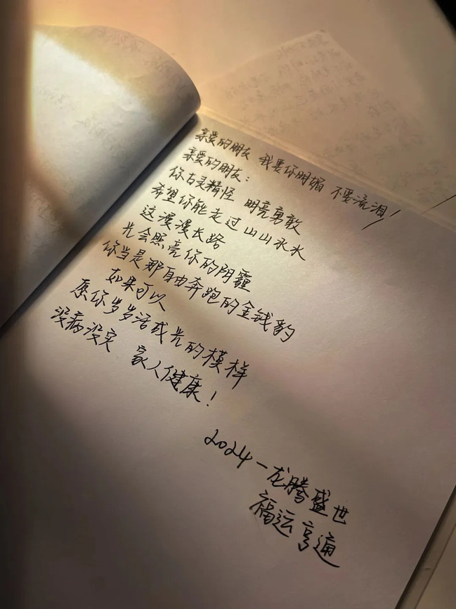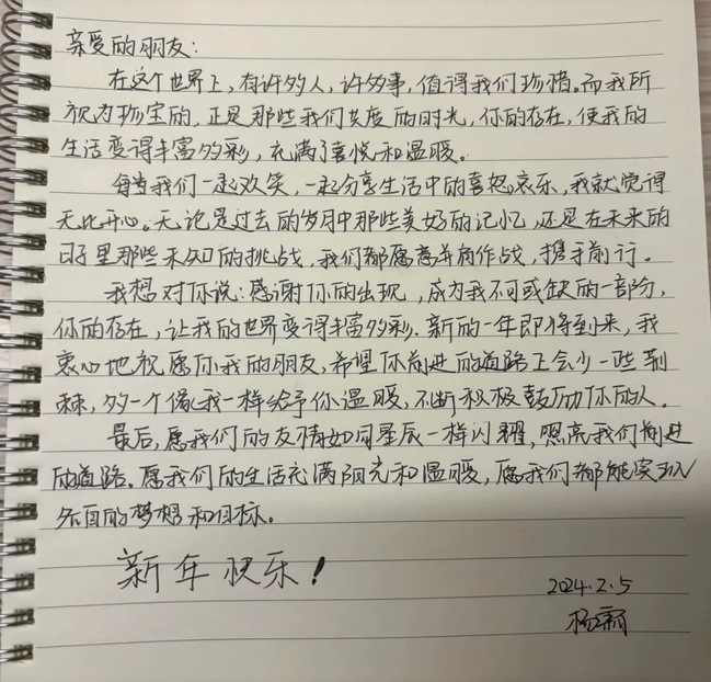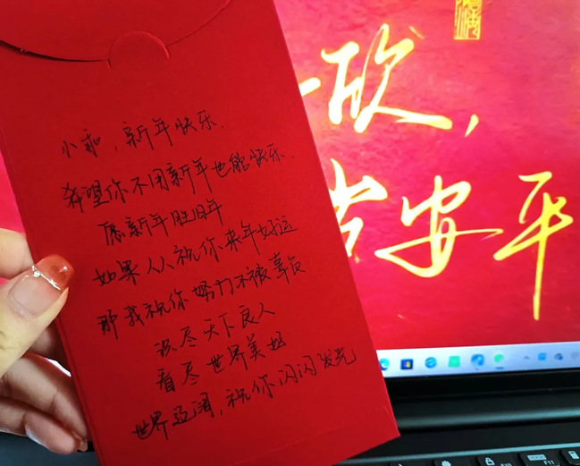 2023 癸卯年岁末,2024 甲辰年岁初,时序轮替,辞旧迎新。我们又迎来新的一年。多少个一元复始,多少次万象更新。我们坐下好好回望这一年,从中打捞起一些愉悦或沮丧的片段:在禾园餐厅吃到美味的螺蛳粉,在下雪时欣赏美丽的雪景,或是在赶往课堂的匆匆忙忙。为了丰富同学们的假期生活,增添趣味,让同学们体味书香,感受文字的魅力,由擦边短剧 学生会学习部举办的此次“喜迎新春,书信同行”新年见信好手写信活动正向我们缓缓展开画卷。