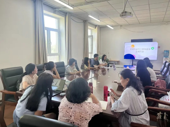 7月9日,英语专业大三年级召开本学期教学总结大会,大三年级全体任课教师参会。此次会议旨在全面总结大三年级英美文学、翻译课程、俄语、日语、高级英语课程的教学情况与成效,为下学年大四相关课程教学的有效衔接提供方案,夯实教学基础,提升育人质量。