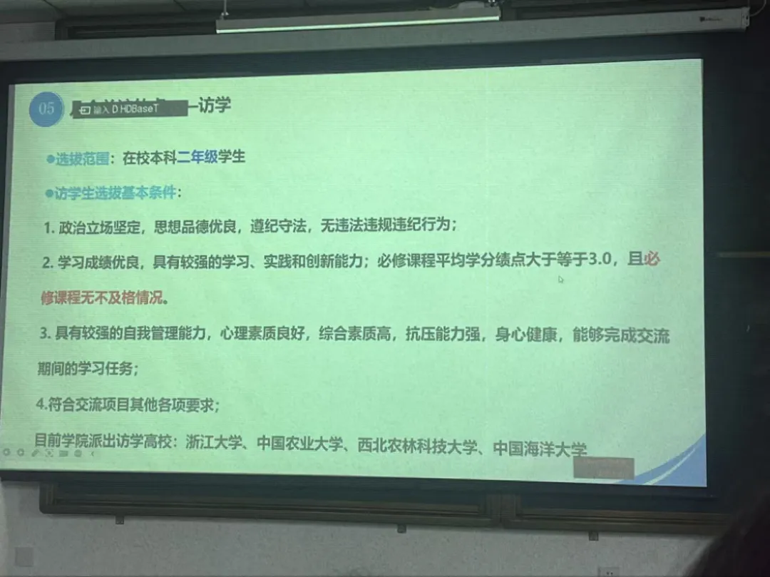 “读万卷书,行万里路。”黄老师着重介绍了学院的访学项目,为学子们打开了通往国内顶尖学府的大门。“面向本科二年级同学的访学项目,是你们大学生涯中一次宝贵的跃迁机会。”黄老师鼓励道,“目前,我们的合作高校包括浙江大学、中国农业大学、西北农林科技大学、中国海洋大学等。”同时,她也明确了这份机遇背后的责任与要求:“申请访学,需要大家政治立场坚定,成绩优良,希望有志于此的同学,从大一就开始精心规划,蓄力前行。”