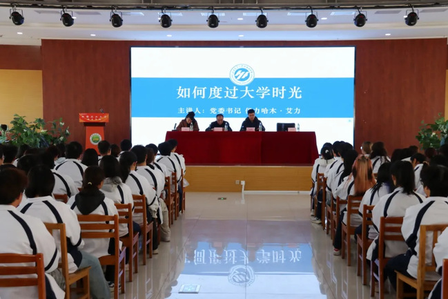 本次会议由英语2502班马安琪同学主持,学院党委书记伊力哈木·艾力、院长张建磊、副院长王婷、辅导员吴宇婷一行与全体新生面对面交流,现场气氛温馨而热烈。