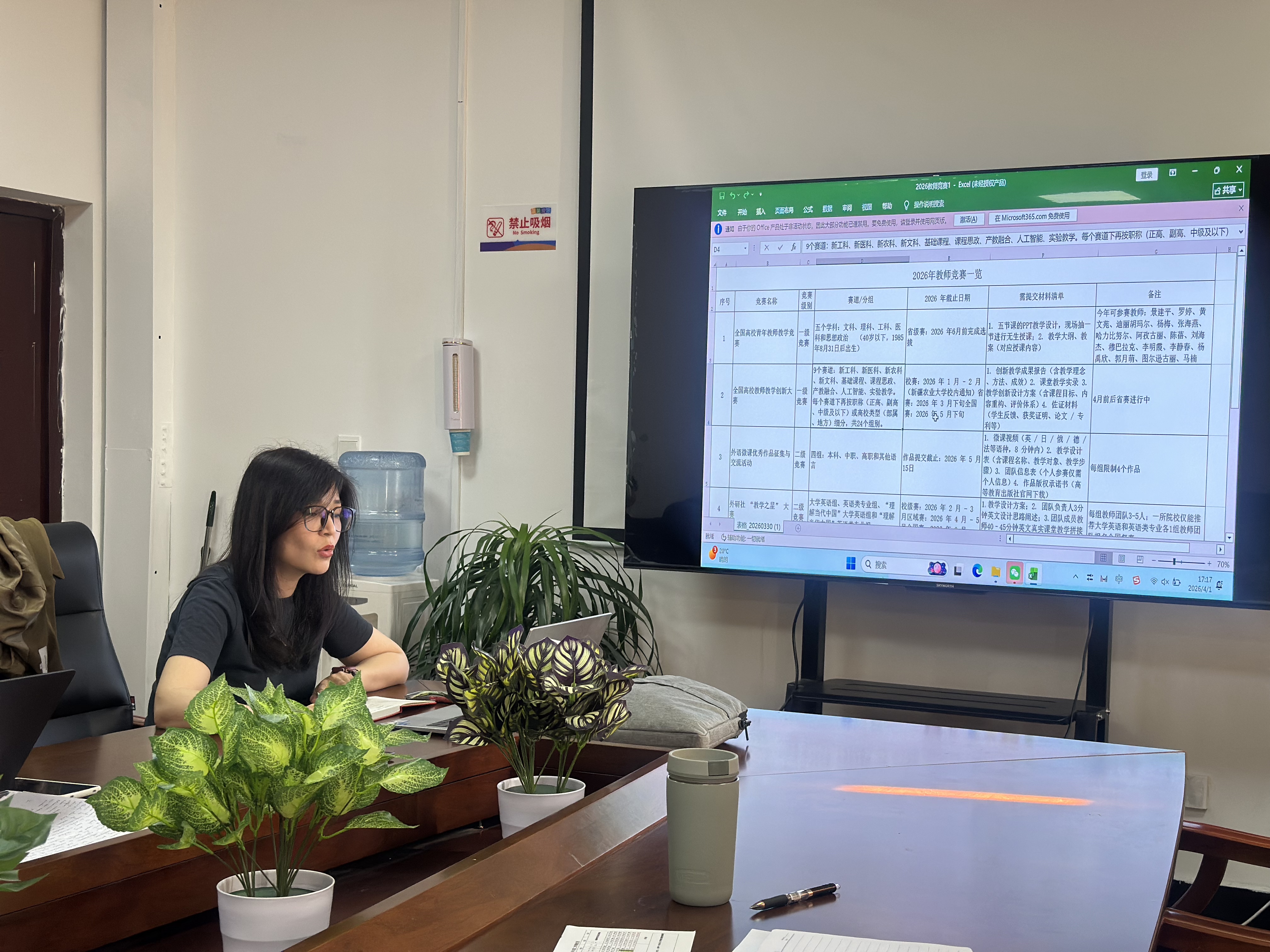 同时,学院聚焦教师竞赛进行了全面解读与统筹规划。迪丽老师按竞赛级别、赛道分组、提交材料清单及注意事项等维度,对全国高校青年教师教学竞赛、教学创新大赛、外语微课、教学之星、教学基本功大赛等赛事要求与备赛要点作了细致说明,帮助教师明确自身参赛方向与准备重点。